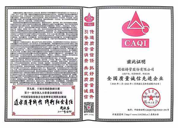 公司堅持以質(zhì)量為生命,以滿足用戶需求作為自己的追求,依靠雄厚的技術(shù)力量和先進(jìn)的生產(chǎn)、檢測設(shè)備,對生鐵、球墨鑄鐵管產(chǎn)品進(jìn)行全過程控制,產(chǎn)品質(zhì)量得到全面的保證